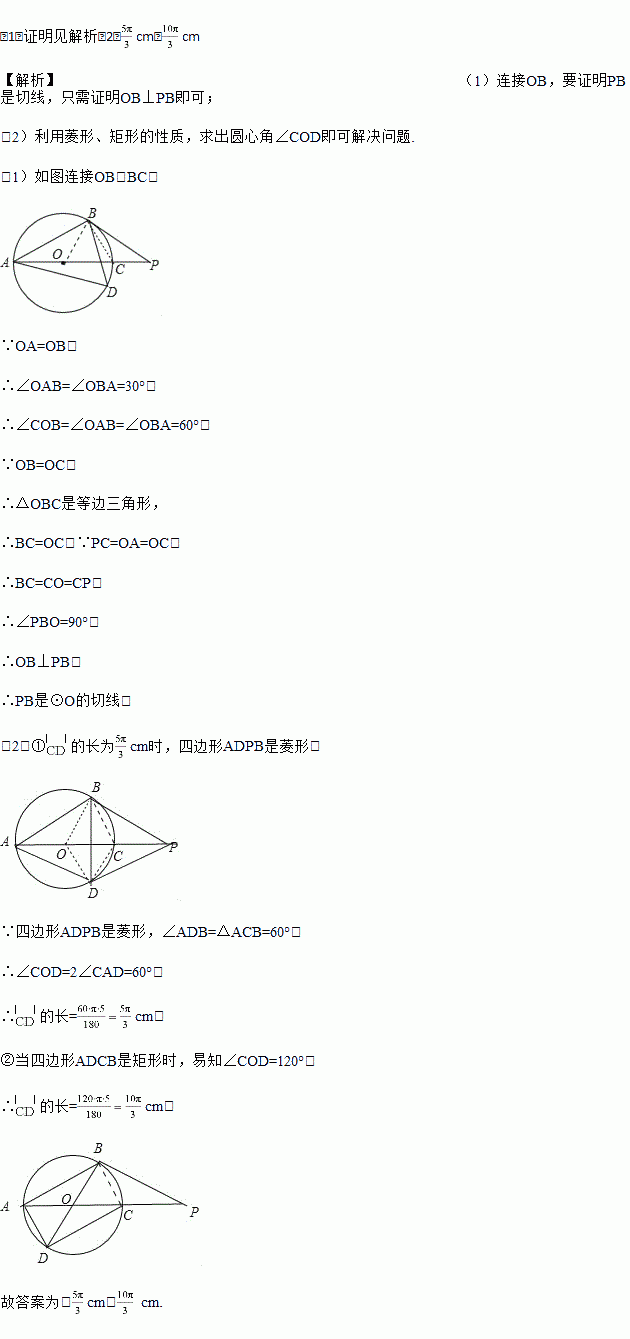 (2)若D为圆O上任一动点,⊙O的半径为5cm时,当弧CD长为 时,四边形ADPB为菱形,当弧CD长为 时,四边形ADCB为矩形.
