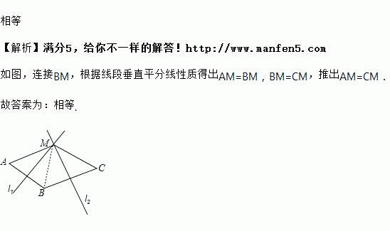 如图,已知线段AB、BC的垂直平分线l1、l2交于点D,则线段AD,CD的大小关系是:_________;