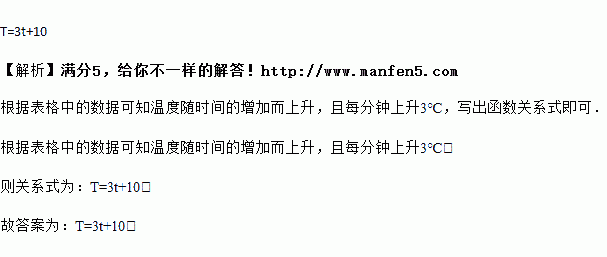 下表记录了一次实验中的时间和温度的数据,写出T与t的关系式____.