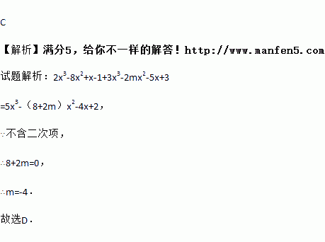 多项式2x3-8x2+x-1与多项式3x3+2mx2-5x+3的和不含二次项,则m为( )