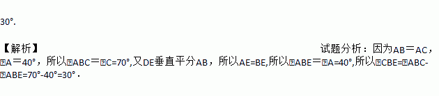 如图,在△ABC中,AB=AC,∠A=40°,AB的垂直平分线交AB于点D,交AC于点E,连接BE,则∠CBE的度数为 .