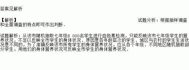 为了解某市在校学生的身体营养状况,可通过抽取学生的血样进行血色素检测,现随机抽取该市七年级8 000名学生进行血色素检测,以此来估计该市在校学生的营养状况,你认为这种调查是否可行?请说明理由,如果不能准确反映该市学生的身体营养状况,你认为应该怎样调查更合理一些?