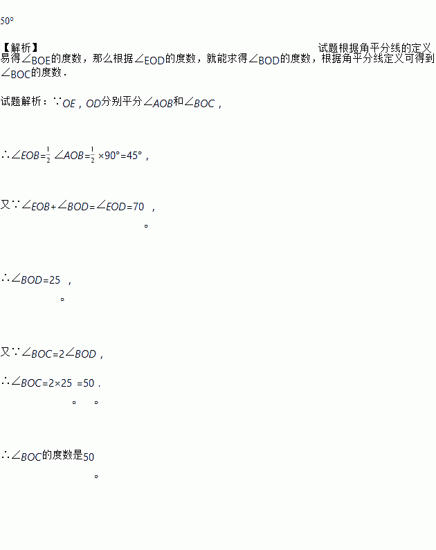 如图,已知OE、OD分别平分∠AOB和∠BOC,若∠AOB=90°,∠EOD=70°,求∠BOC的数。