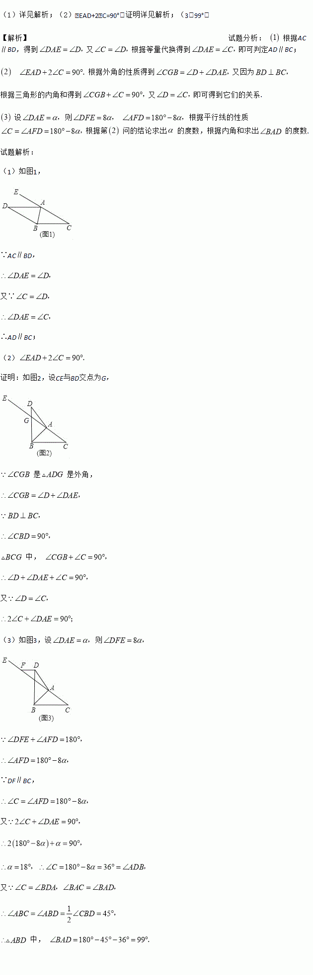 (3)如图3,在(2)的条件下,过点D作DF∥BC交射线于点F,当∠DFE=8∠DAE时,求∠BAD的度数.