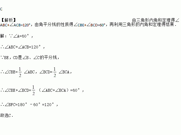 如图,△ABC中,∠ABC,∠ACB的平分线BE,CD相交于点F,∠ABC=42°,∠A=60°,则∠BFC=( )