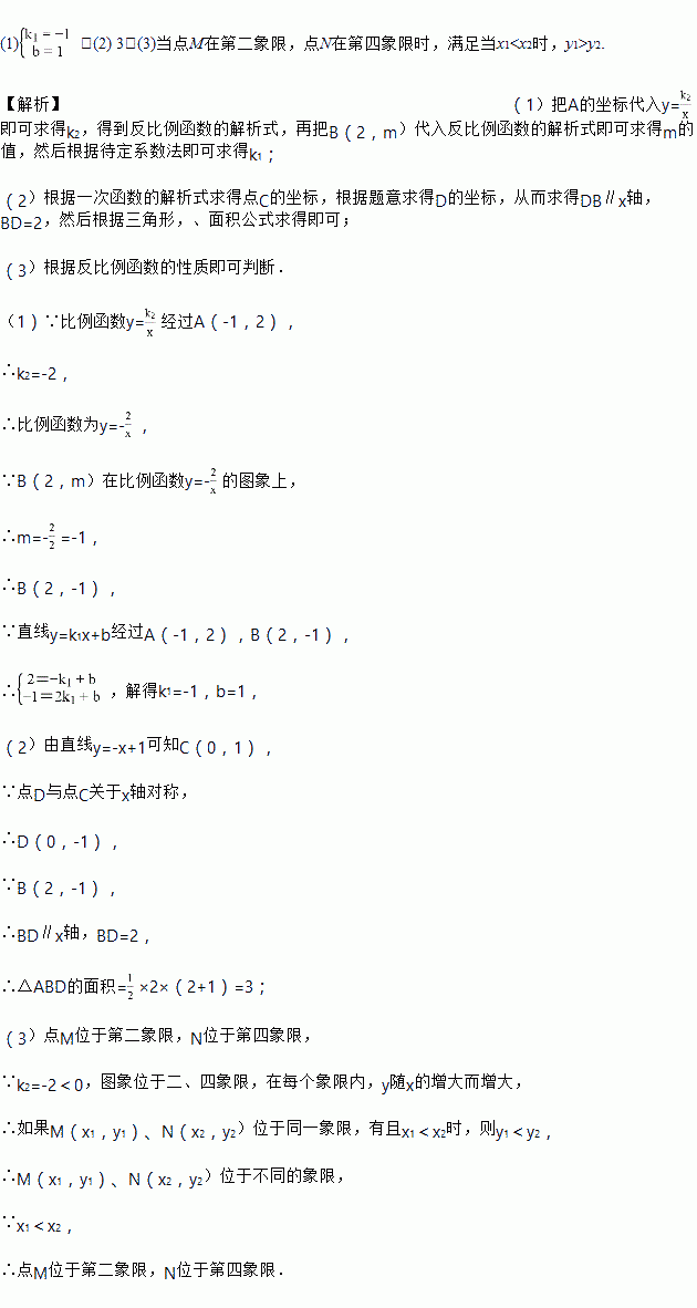 (k2≠0)相交于A(-1,2),B(2,m)两点,与y轴相交于点C.