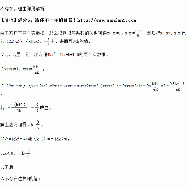 已知x1,x2是关于x的一元二次方程4kx2-4kx+k+1=0的两个实数根,是否存在实数k,使(2x1-x2)(x1-2x2)=-成立?若存在,求出k的值;若不存在,请说明理由.