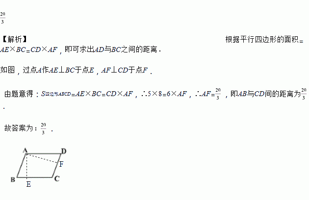 如图,□ABCD中,AB、BC长分别为6和8,边AD与BC 之间的距离为5,则AB与CD间的距离为__________.