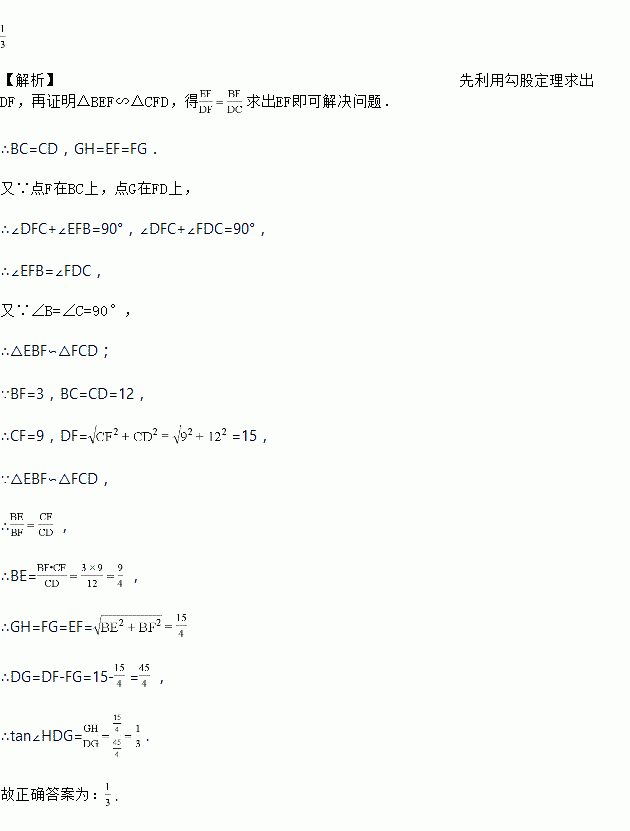 有这样一道题:如图,在正方形ABCD中,有一个小正方形EFGH,其中E,F,G分别在AB,BC,FD上,连接DH,如果BC=12,BF=3.则tan∠HDG的值为____.
