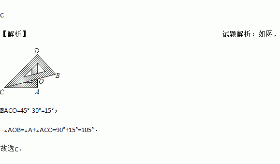 C 【解析】试题解析:如图, ∠ACO=45°-30°=15°, ∴∠AOB=∠A+∠ACO=90°+15°=105°. 故选C.