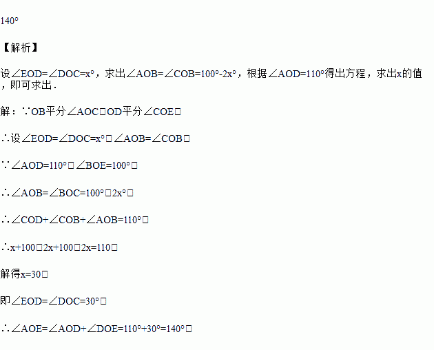 如图,已知OB平分∠AOC,OD平分∠COE,∠AOD=110°,∠BOE=100°,求∠AOE的度数.