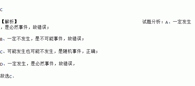 C 【解析】试题分析:A、一定发生,是必然事件,故错误; B、一定不发生,是不可能事件,故错误; C、可能发生也可能不发生,是随机事件,正确; D、一定发生,是必然事件,故错误, 故选C.