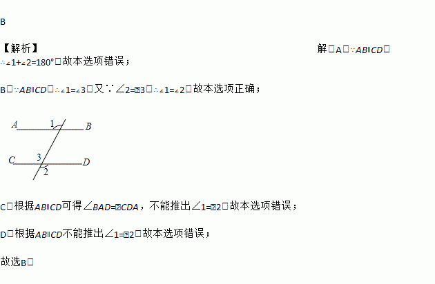 下列图形中由AB∥CD能得到∠1=∠2的是( )