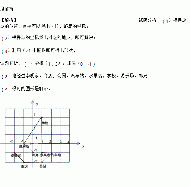 (1)根据图中所建立的平面直角坐标系,写出学校、邮局的坐标;
