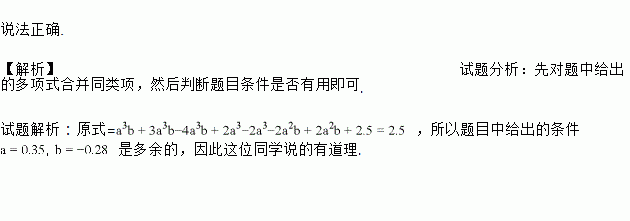 ˵·¨ÕýÈ·. ¡¾½âÎö¡¿ÊÔÌâ·ÖÎö£ºÏȶÔÌâÖиø³öµÄ¶àÏîʽºÏ²¢Í¬ÀàÏȻºóÅжÏÌâÄ¿Ìõ¼þÊÇ·ñÓÐÓü´¿É. ÊÔÌâ½âÎö£ºÔʽ= £¬ËùÒÔÌâÄ¿Öиø³öµÄÌõ¼þ ÊǶàÓàµÄ£¬Òò´ËÕâλͬѧ˵µÄÓеÀÀí.
