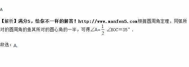 如图,A,B,C是⊙O上的三点,∠BOC=70°,则∠A的度数为( )
