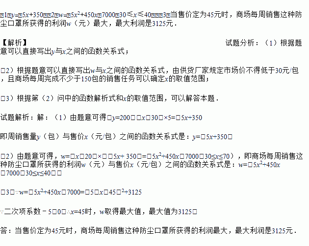 (3)当售价x(元/包)定为多少元时,商场每周销售这种防尘口罩所获得的利润w(元)最大?最大利润是多少?