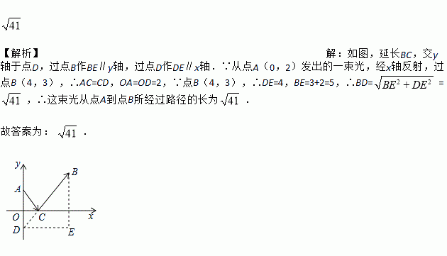 如图,从点A(0,2)发出一束光,经x轴反射,过点B(4,3),则这束光从点A到点B所经过的路径的长为_____.