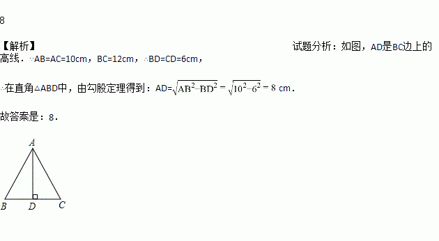 如图,在等腰△ABC中,AB=AC=10 cm,BC=12 cm,则BC边上的高AD是_____ cm.