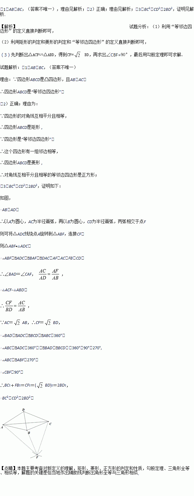 (3)如图2,“等邻边四边形”ABCD中,AB=AD,∠BAD+∠BCD=90°,AC,BD为对角线,AC=