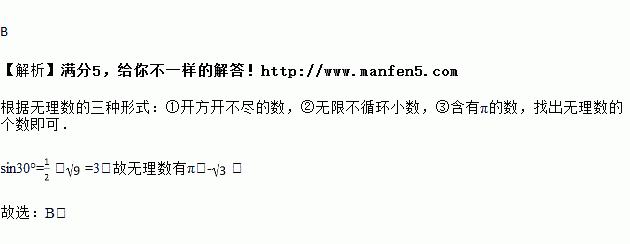 下列各数:π,sin30°,﹣ ,其中无理数的个数是( )