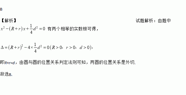 B 【解析】试题解析:由题中有两个相等的实数根可得, 即R+r=d,由圆与圆的位置关系判定法则可知,两圆的位置关系是外切. 故选B.