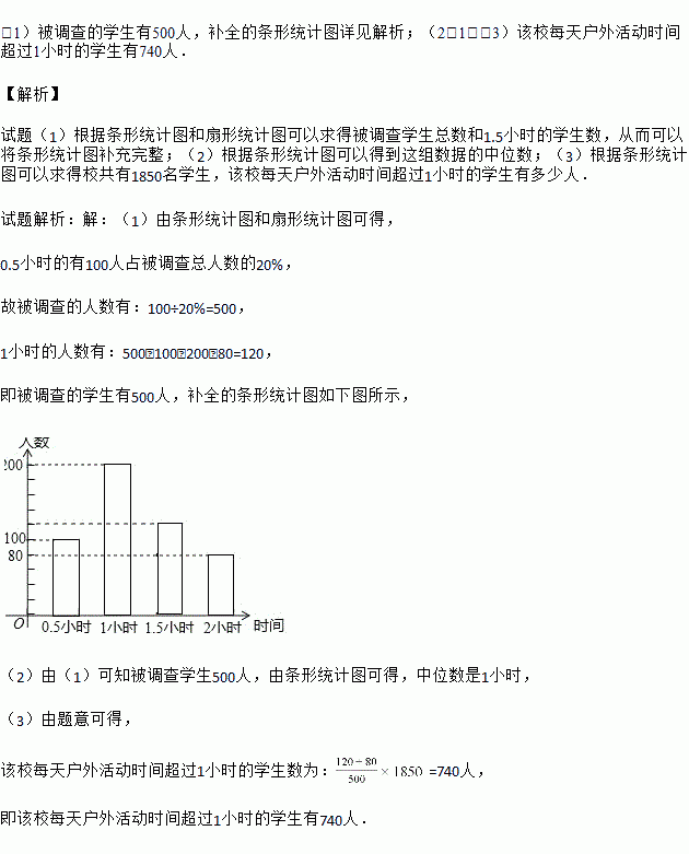 (3)该校共有1850名学生,请估计该校每天户外活动时间超过1小时的学生有多少人?