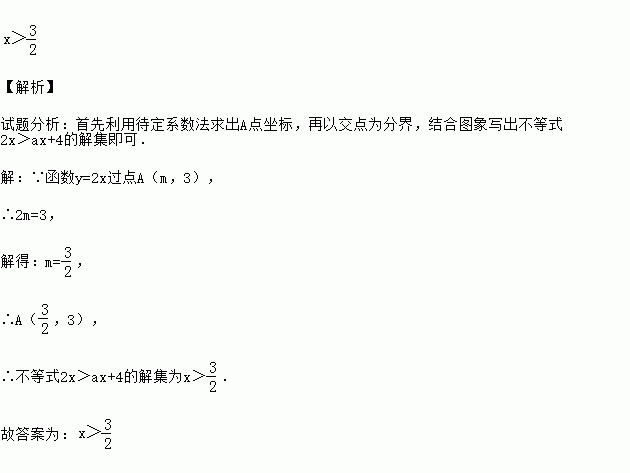 如图,函数y=2x和y=ax+4的图象相交于点A(m,3),则不等式2x>ax+4的解集为 .