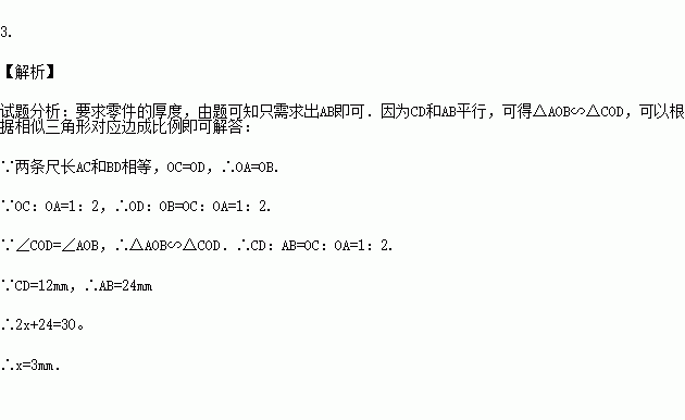 如图,已知零件的外径为30 mm,现用一个交叉卡钳(两条尺长AC和BD相等,OC=OD)测量零件的内孔直径AB.若OC∶OA=1∶2,且量得CD=12 mm,则零件的厚度x=____________mm.