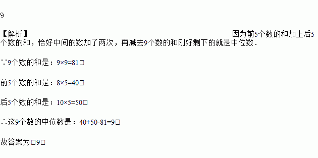 把9个数按从小到大的顺序排列,其平均数是9,如果这组数中前5个数的平均数是8,后5个数的平均数是10,则这9个数的中位数是____.