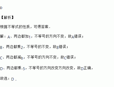 A. a+1<b+1 B. 2a<2b C. a﹣b<0 D. ﹣5a<﹣5b