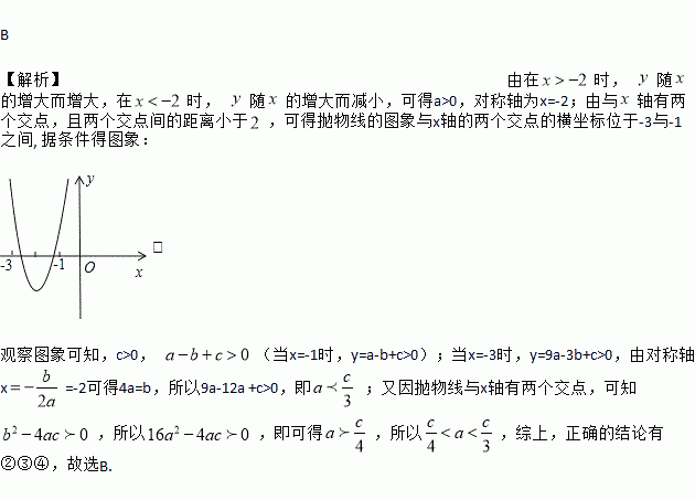B 【解析】由在时, 随的增大而增大,在时, 随的增大而减小,可得a>0,对称轴为x=-2;由与轴有两个交点,且两个交点间的距离小于,可得抛物线的图象与x轴的两个交点的横坐标位于-3与-1之间, 据条件得图象: , 观察图象可知,c>0, (当x=-1时,y=a-b+c>0);当x=-3时,y=9a-3b+c>0,由对称轴x=-2可得4a=b,所以9a-12a +c>0,即 ;又...