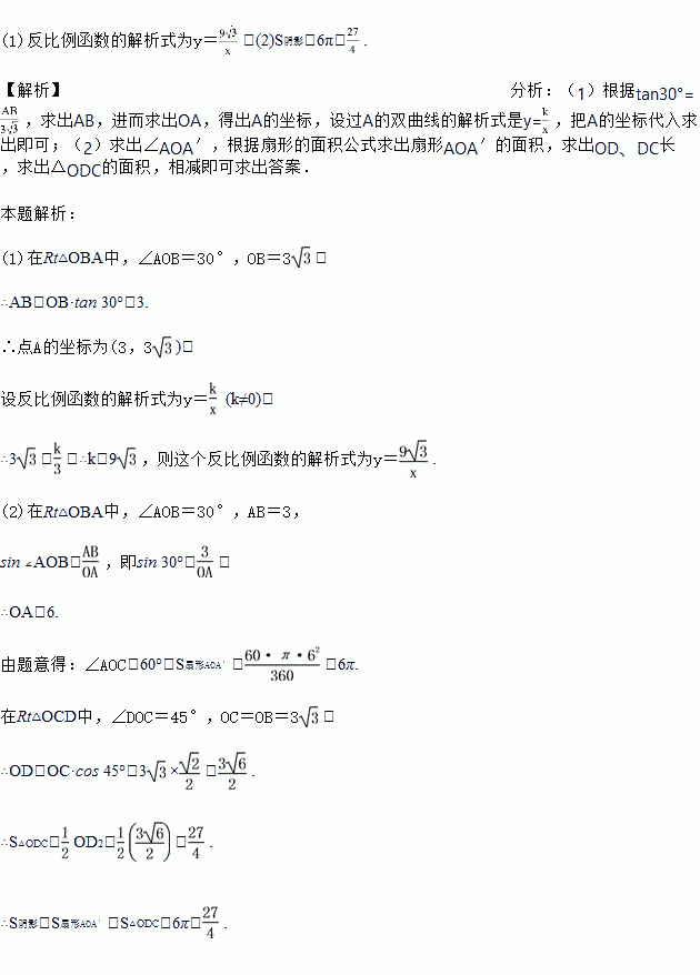 (2)若把含30°角的直角三角板绕点O按顺时针方向旋转后,斜边OA恰好落在x轴上,点A落在点A′处,试求图中阴影部分的面积.(结果保留π)