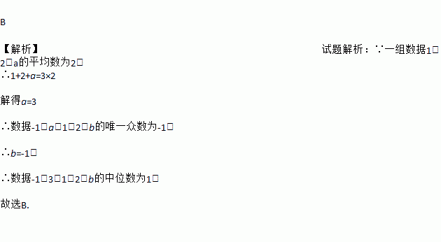一组数据1,2, 的平均数为2,另一组数据-l, ,1,2,b的唯一众数为-l,则数据-1, , ,1,2的中位数为( )