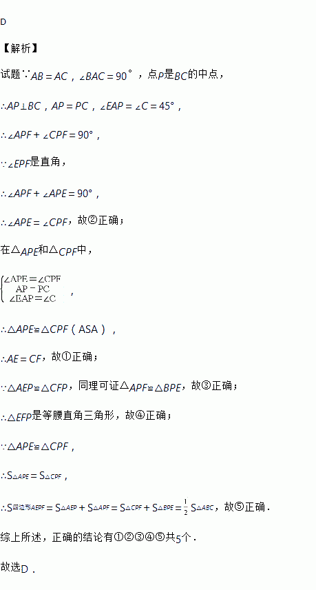 如图已知在△ABC中,AB=AC,∠BAC=90°,直角∠EPF的顶点P是BC的中点,两边PE、PF分别交AB和AC于点E、F,给出以下五个结论正确的个数有( )