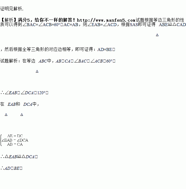 已知,如图,等边△ABC中,点D为BC延长线上一点,点E为CA延长线上一点,且AE=DC.求证:AD=BE.