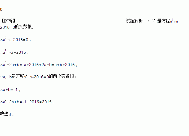 设a、b是方程x2+x-2016=0的两个实数根,则a2+3a+2b的值为( )
