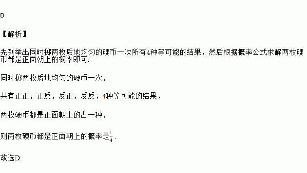 同时掷两枚质地均匀的硬币一次,两枚硬币都是正面朝上的概率是( )