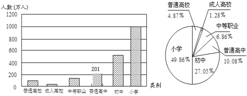 (2)再由普通高中在校生人数占的比例求出普通高中在校生人数;补出条形统计图,可以看出成人高校人数最少,应发展成人教育;