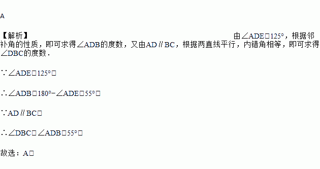 如图,一把矩形直尺沿直线断开并错位,点E、D、B、F在同一条直线上,若∠ADE=125°,则∠DBC的度数为( )