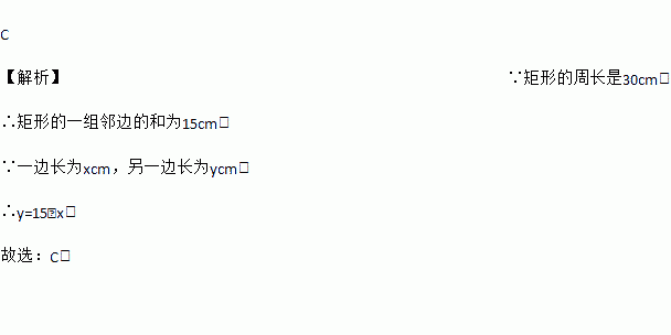 C 【解析】∵矩形的周长是30cm, ∴矩形的一组邻边的和为15cm, ∵一边长为xcm,另一边长为ycm. ∴y=15﹣x, 故选:C.