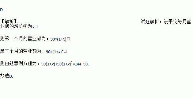 某超市1月份营业额为90万元,1月、2月、3月总营业额为144万元,设平均每月营业额增长率为,则下面所列方程正确的是( )