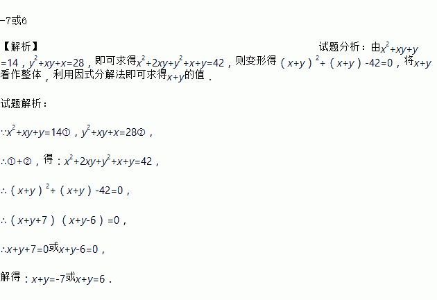 -7或6 【解析】试题分析:由x2+xy+y=14,y2+xy+x=28,即可求得x2+2xy+y2+x+y=42,则变形得(x+y)2+(x+y)-42=0,将x+y看作整体,利用因式分解法即可求得x+y的值. 试题解析: ∵x2+xy+y=14①,y2+xy+x=28②, ∴①+②,得:x2+2xy+y2+x+y=42, ∴(x+y)2+(x+y)-42=0, ...