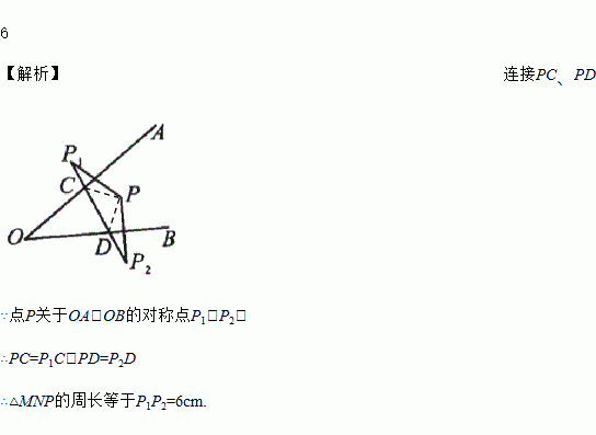 如图,点P关于OA,OB的对称点分别是P1,P2,P1P2分别交OA,OB于点C,D,P1P2=6cm,则△PCD的周长为___________.