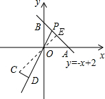 分析:连接CO并延长与AB交于点E,由一次函数y=-x+2的斜率为-1,直线CO的斜率为1,得到两斜率的乘积为-1,进而确定出CE垂直于AB,再由CD垂直于PO,得到一对直角相等,再由一对对顶角相等,利用两对对应角相等的两三角形相似,得到三角形POE与三角形CDO相似,由相似得比例列出关系式,对于直线y=-x+2,令x=0求出y=2,令y=0求出x=2,得到OA=OB,即三角形AOB为等腰直角三角形,由OE垂直于AB,利用三线合一得到E为AB的中点,根据勾股定理求出AB的长,由OE等于AB的一半求出OE的长,由C的坐标求出OC的长,将OE与OC以及PO=t,DO=s代入,即可确定出s与t的函数关系式.