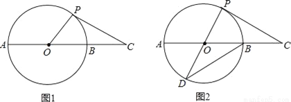 如图1,延长⊙O的直径AB至点C,使得BC=AB,点P是⊙O上半部分的一个动点(点P不与A、B重合),连结OP,CP.