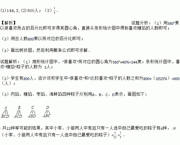 (2)若该校学生人数为800人,请根据上述调查结果,估计该校学生中“很喜欢”和“比较喜欢”粽子的人数之和;