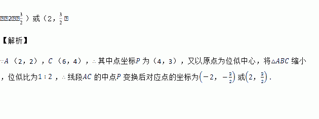 如图,△ABC三个顶点的坐标分别为A(2,2),B(4,0),C(6,4)以原点为位似中心,将△ABC缩小,位似比为1:2,则线段AC中点P变换后对应点的坐标为_____.