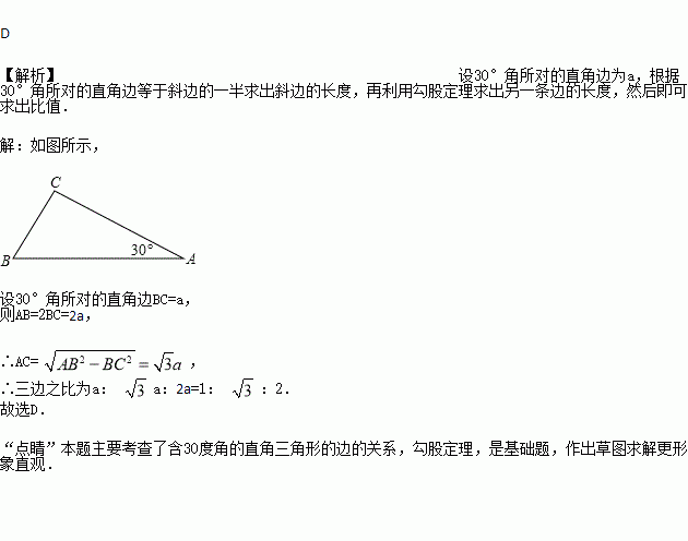 在直角三角形中,如果有一个角是30°,那么下列各比值中,是这个直角三角形的三边之比的是()