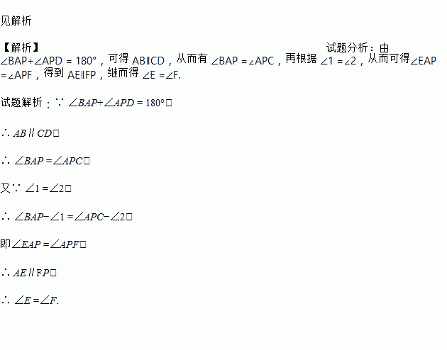 已知:如图,∠BAP+∠APD =180°,∠1 =∠2.求证:∠E =∠F.